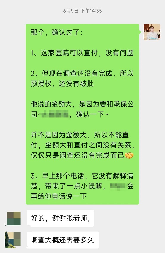 张玉凯从客户确诊之初便全程介入,不仅提供了精准的医疗资源导航,更在理赔各环节主动作为、据理力争,成功为客户争取到直付资格及协商赔付。
