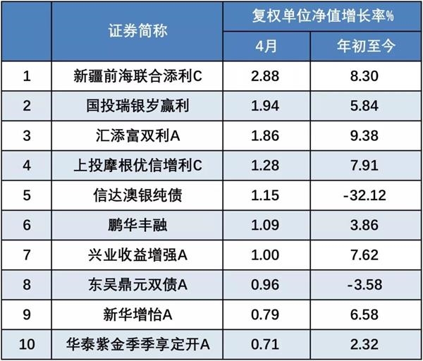 4月债券基金涨幅最大的是新疆前海联合添利C,达到2.88%,它是一只混合型二级债基,不过根据最新报告期,它并没有持股。排名前十的债基中,仅信达澳银纯债和鹏华丰融两只纯债基金,其余均为混合二级债基。