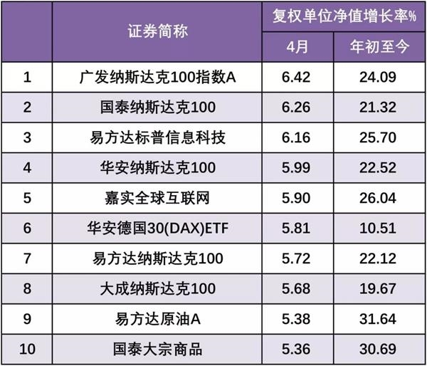 4月A股表现平平,投资于境外股市的QDII类基金的表现似乎也很一般。4月冠军是广发纳斯达克100指数A,涨幅为6.42%。前十上榜的QDII基金以纳斯达克100指数为主,涨幅在5%-7%之间。(这里说明一下,同一只QDII包括A、C类等不同份额,以及人民币和美元现钞、现汇等不同品种,涨幅可能有细微差异,我们都已经剔除了,仅保留了代表性的涨幅最高的一只。)